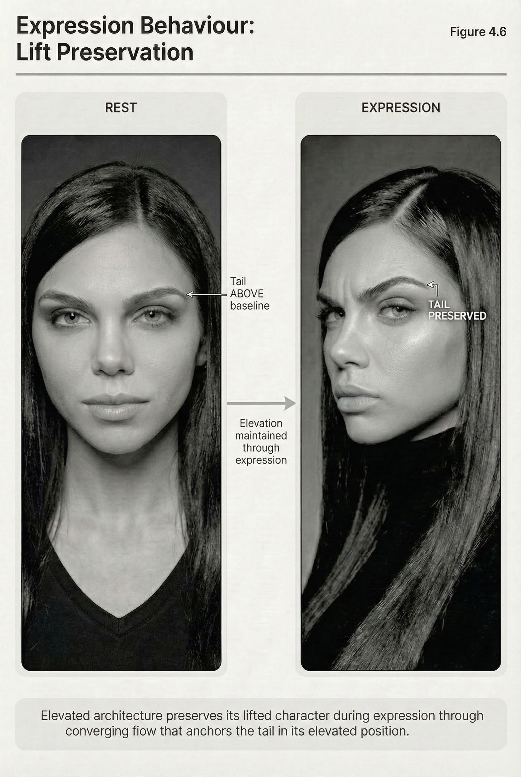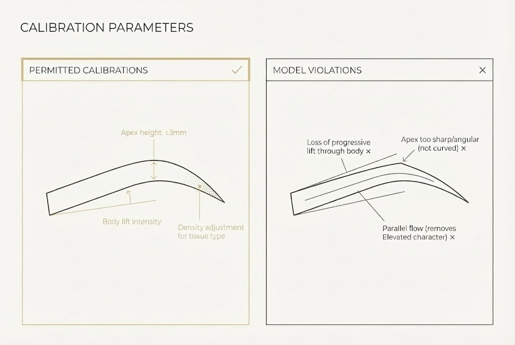 Expression behaviour is a critical consideration. The Elevated brow must maintain its structural intent through facial movement. When the client raises their brows, the apex should lift proportionally. When they furrow, the structure should compress without collapsing. The architecture persists across emotional states.