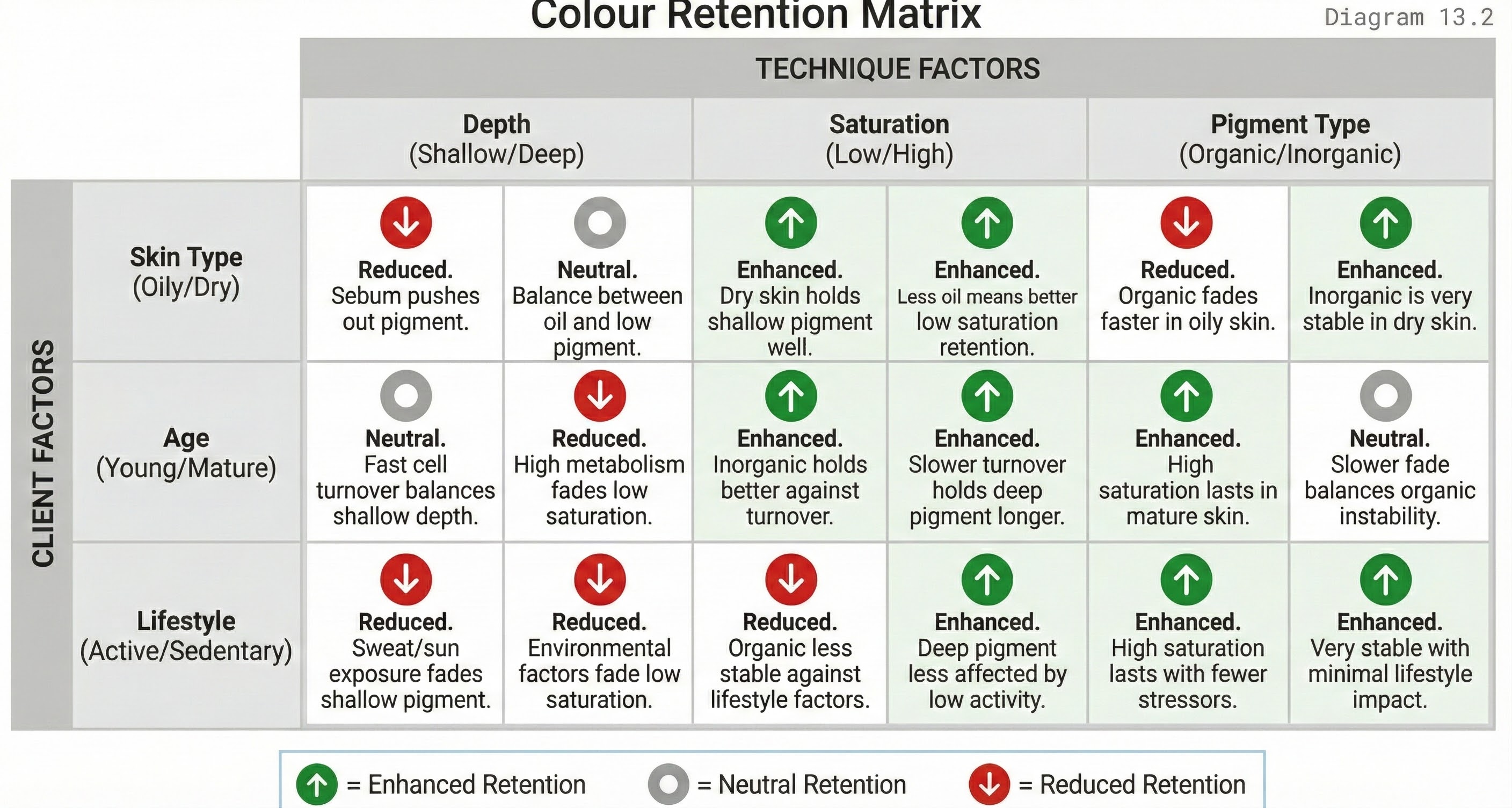 A matrix with client factors (skin type, age, lifestyle, health) on one axis and technique factors (depth, saturation, pigment choice) on the other. Cell entries indicate impact on retention.