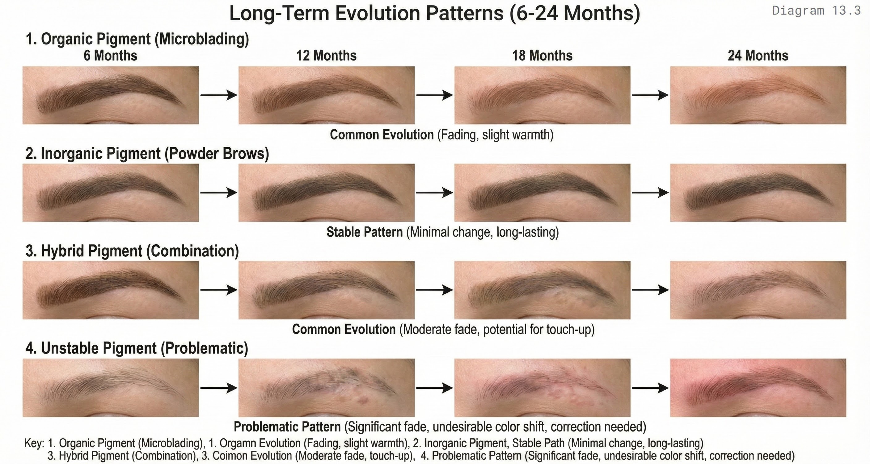 Long-term outcomes (twelve to twenty-four months) follow predictable patterns by technique type. Hairstrokes typically fade faster than powder work because the linear wound channels have more surface area relative to pigment volume. Combination brows often develop an asymmetric fade pattern where the hairstroke component fades before the shading component, requiring the client to decide whether to refresh strokes, add shading, or accept the evolved appearance.