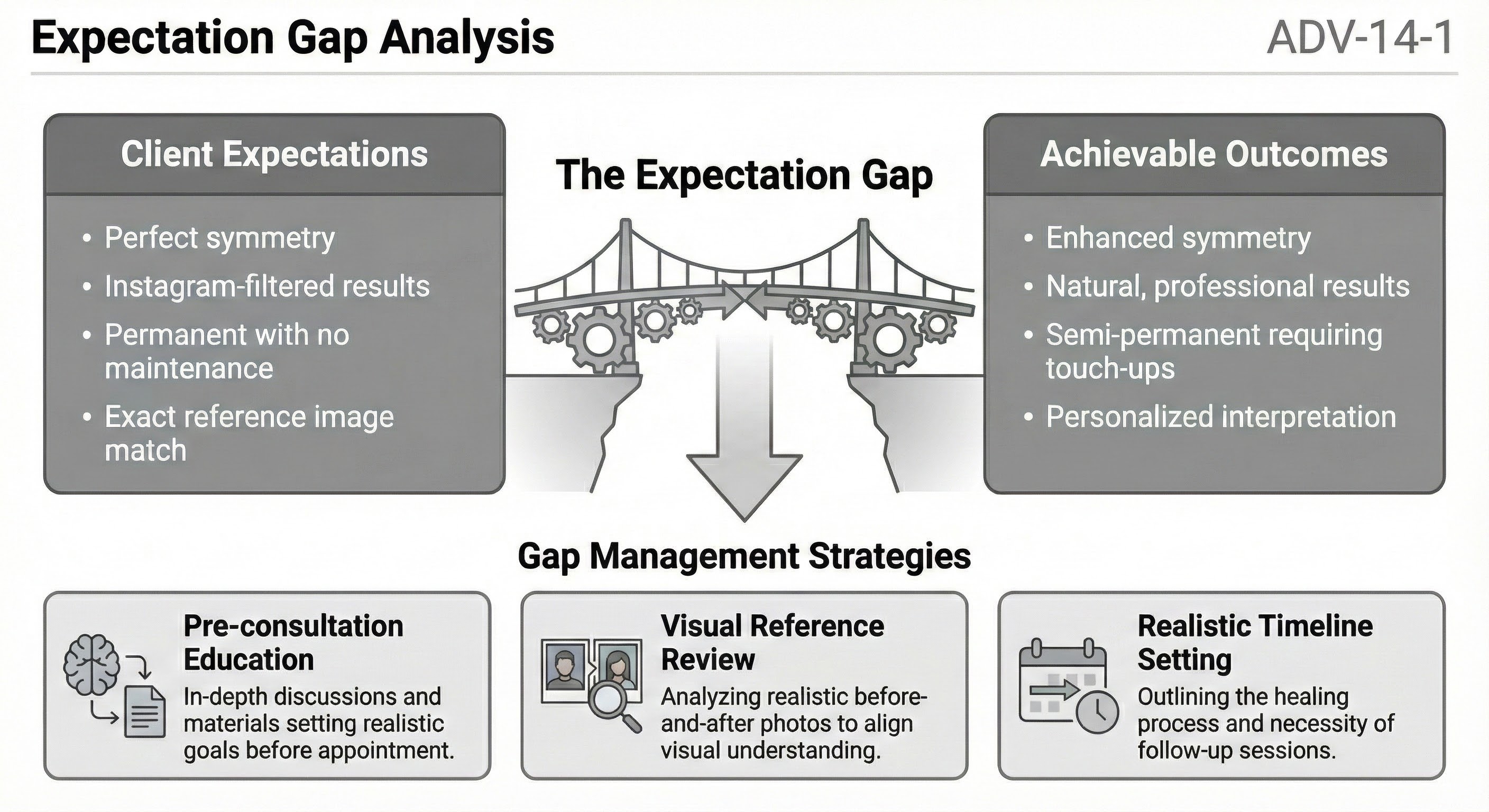 A diagram showing client expectations on one side and achievable outcomes on the other, with the gap between them highlighted. Strategies for bridging or addressing the gap are indicated.