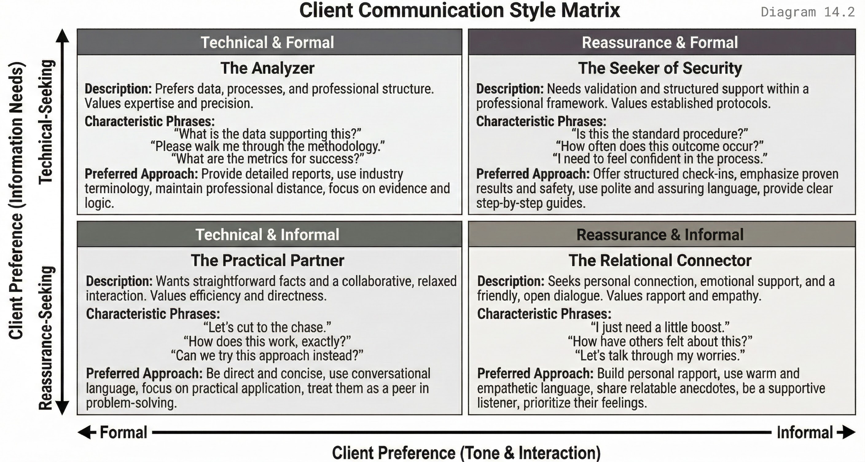 A grid with communication style (technical vs. reassurance-focused) on one axis and formality (formal vs. casual) on the other. Client types are positioned within the grid with appropriate approach notes.