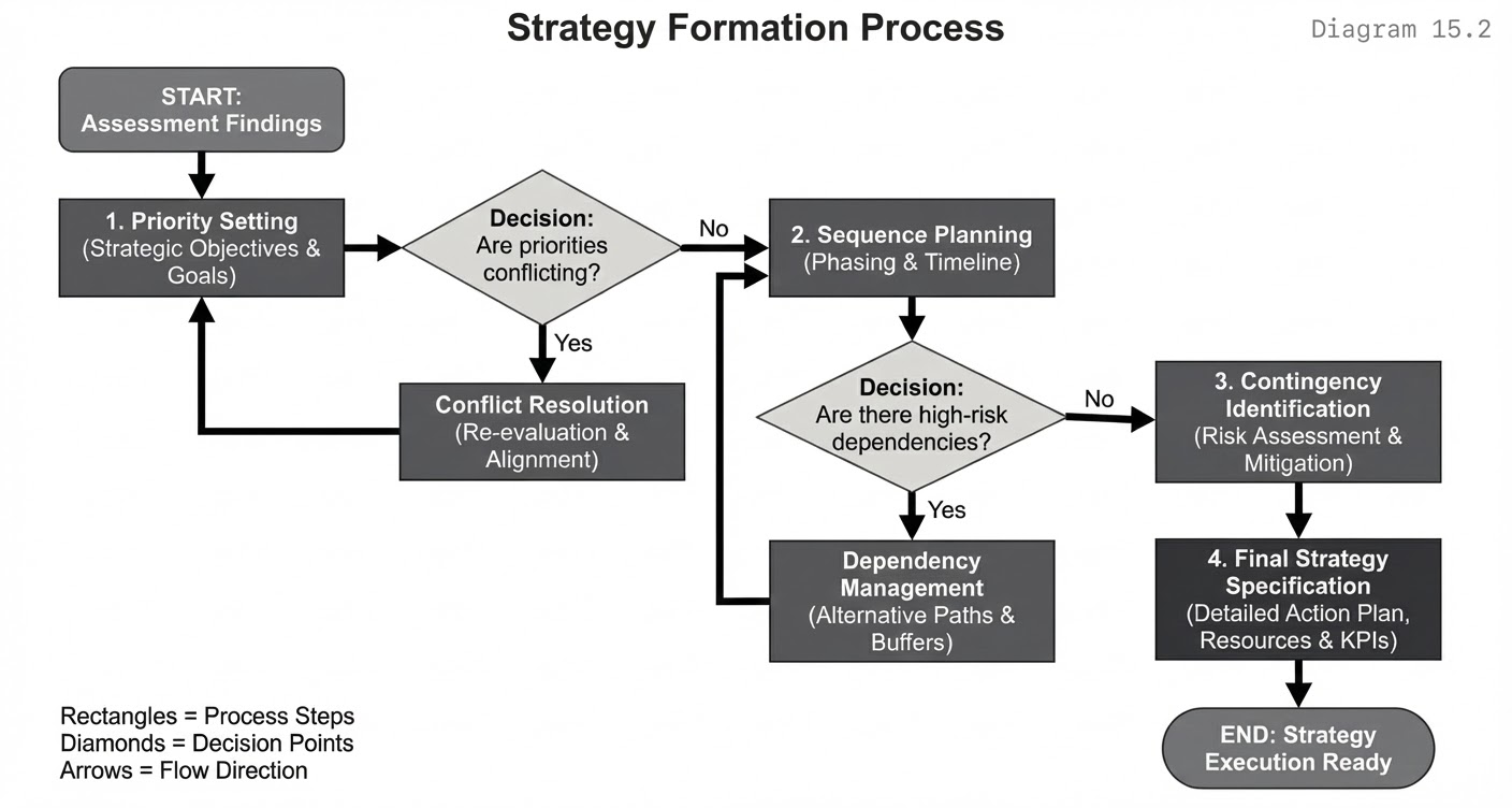 A flowchart showing progression from assessment findings through constraint identification, option generation, option evaluation, and strategy selection.