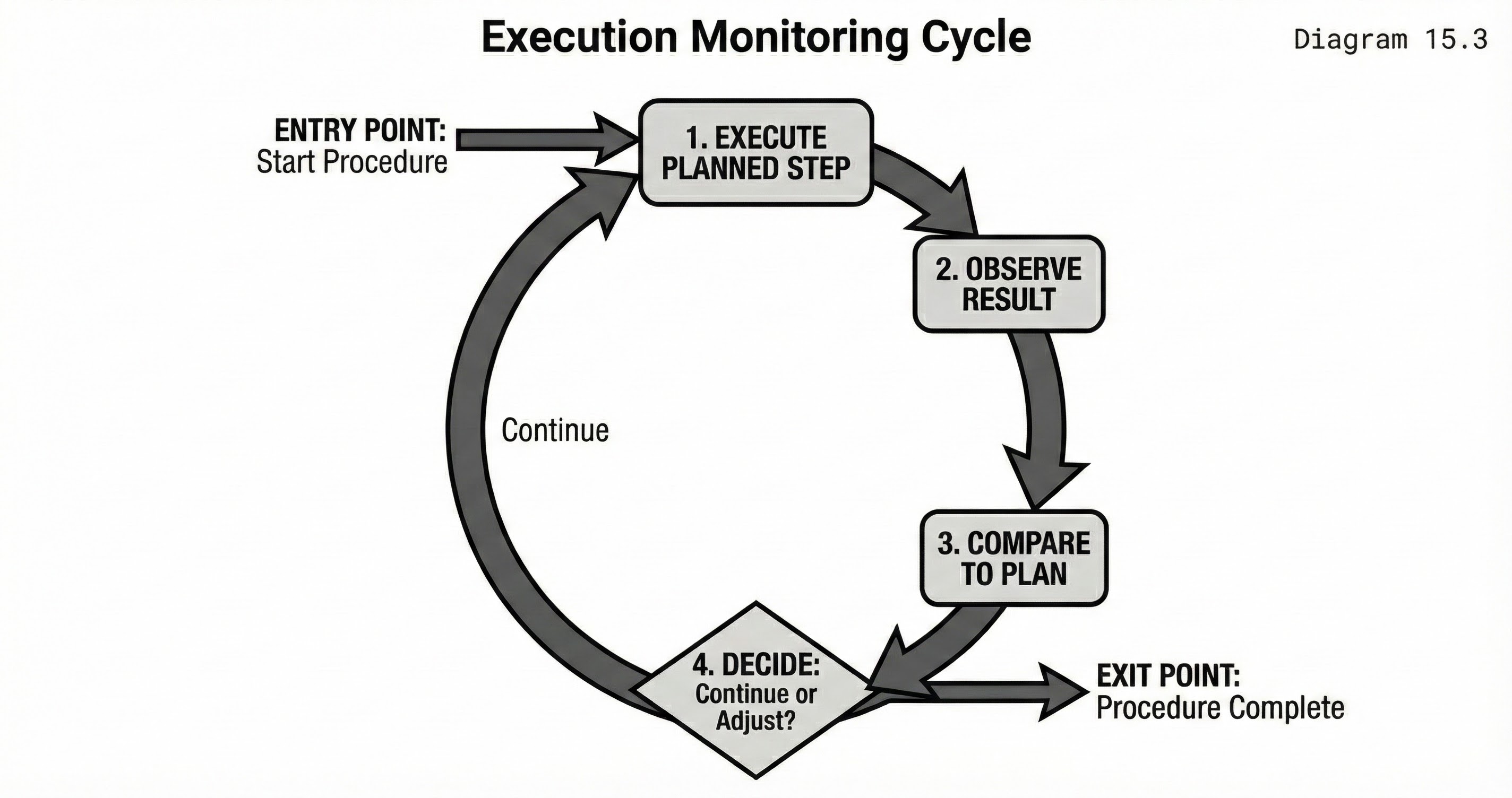 A circular diagram showing the execute-observe-compare-decide cycle used during procedure. Each segment includes key actions and decision criteria.