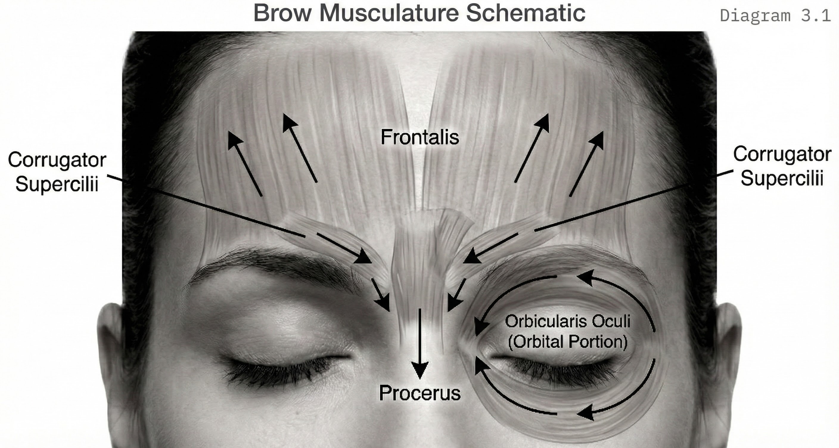 Originates from the medial supraorbital ridge and inserts into brow skin above the mid-pupil. Corrugator contraction pulls the brow medially and inferiorly, creating vertical glabellar creases—the so-called frown lines. Corrugator strength varies across individuals and influences how much the medial brow moves during expression.