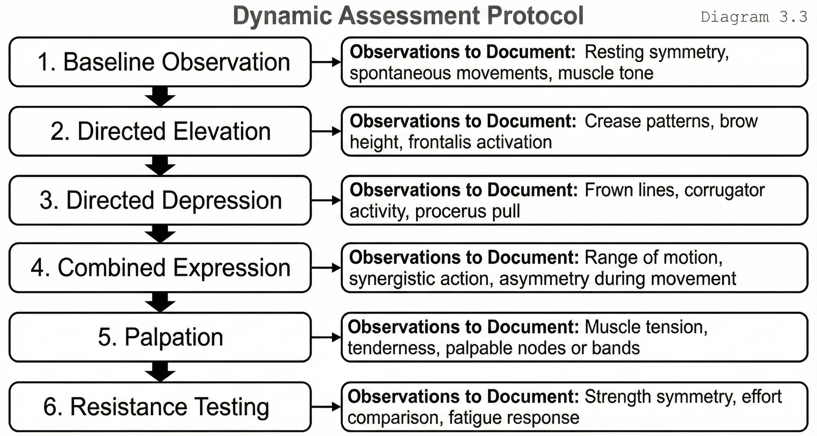 A flowchart showing the sequence of muscle dynamics assessment. Boxes indicate assessment steps (baseline observation, directed elevation, directed depression, combined expression, palpation, resistance testing) with arrows showing progression.
